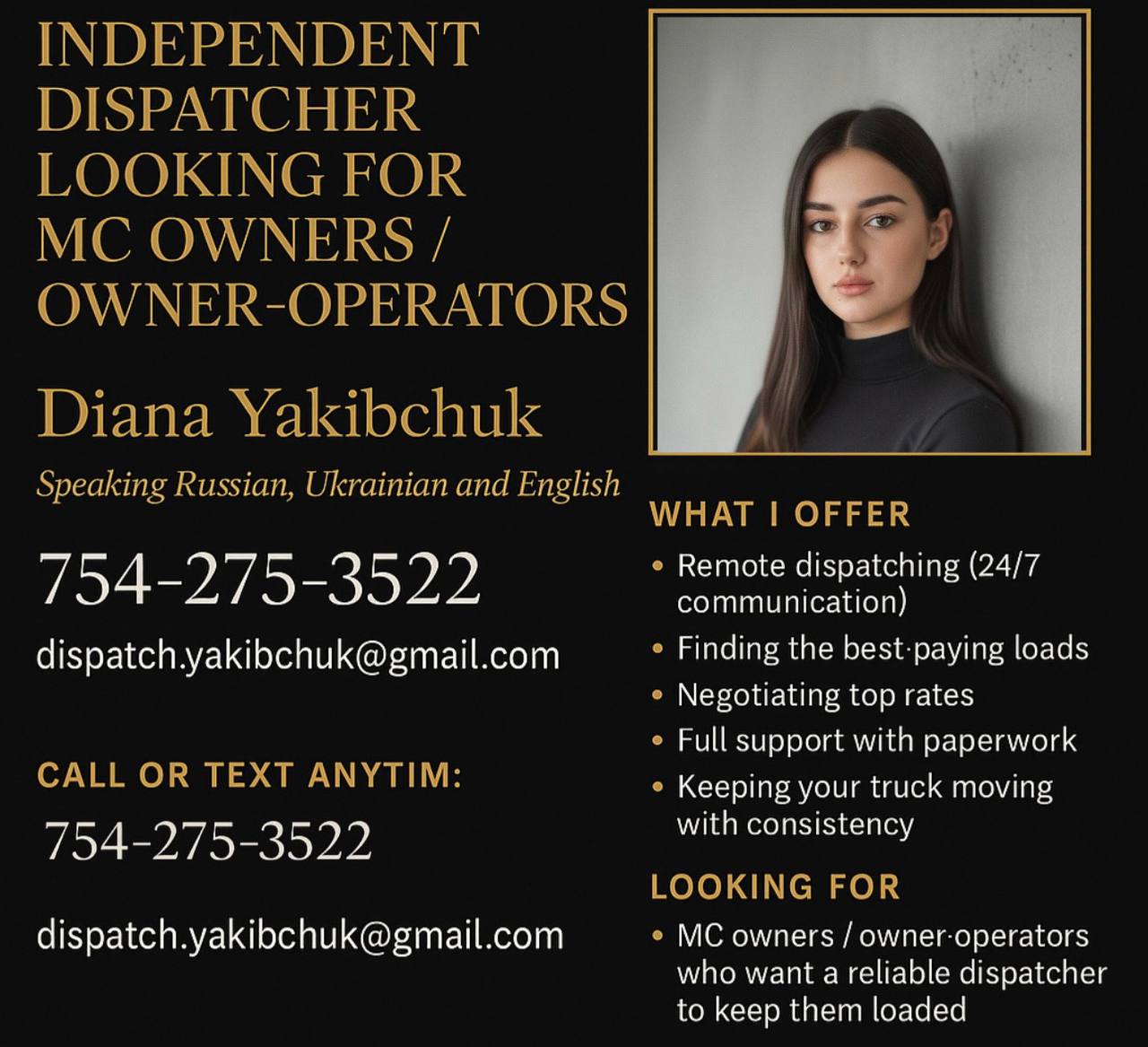Speaking Russian, Ukrainian and English What I offer: Remote dispatching (24/7 communications)  Finding the best paying loads Negotiating top rates  Full support with paperwork Keeping your truck moving with consistency   Diana Yakibc...