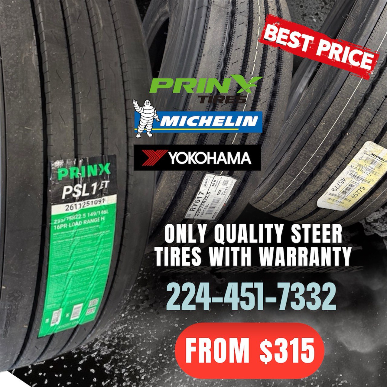 TRAILER TIRES FROM $225 DRIVE TIRES FROM $250 STEER TIRES FROM $315 Only quality tires with Warranty Brand: Prinx, Michelin, Yokohama, DoubleCoin, Accelus, JK-Tyre, Arisun, Tomoro, Phyron. Professional service Installation available Our prices: $450...